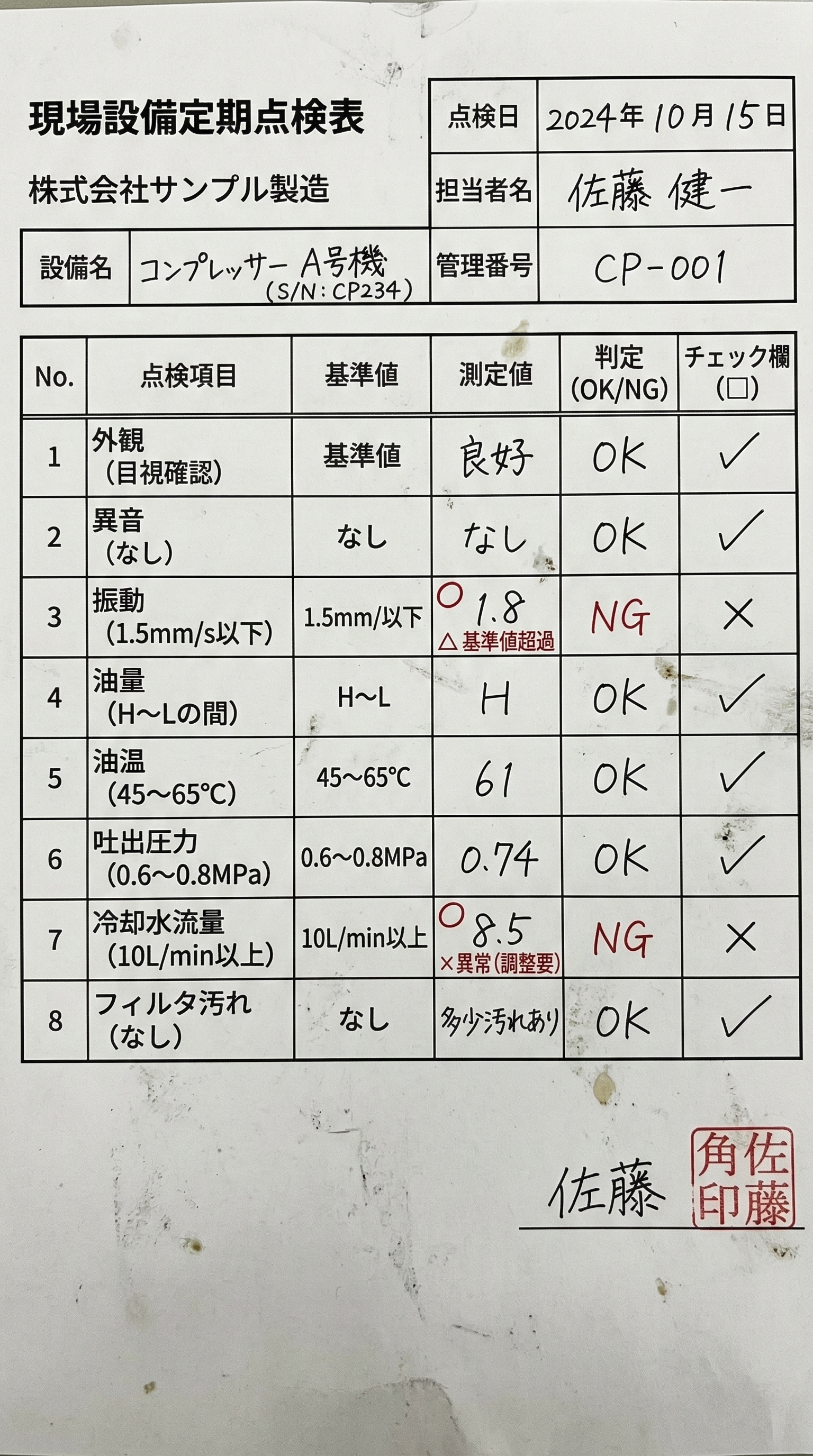 点検票スキャン → 測定値8項目抽出 → 基準値照合・NG自動フラグ → 保全システム更新